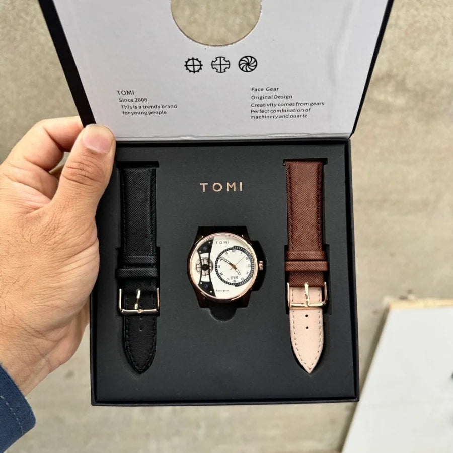 Elevate your wristwear game with the TOMI Face Gear Gentleman Edition Dual-Strap Watcha stylish timepiece designed for versatility and craftsmanship. This luxury-inspired watch comes with two premium straps (leather and chain-style), letting you effortlessly switch between formal and casual looks. Crafted with a stainless steel back, water-resistant build, and durably stitched leather, it's as robust as it is refined. The unique face design and meticulous finish deliver a strong fashion statement suitable for any occasion. Complete with elegant premium packaging and 1-year mechanical warranty, this dual-strap watch combines style and substance with unbeatable value.